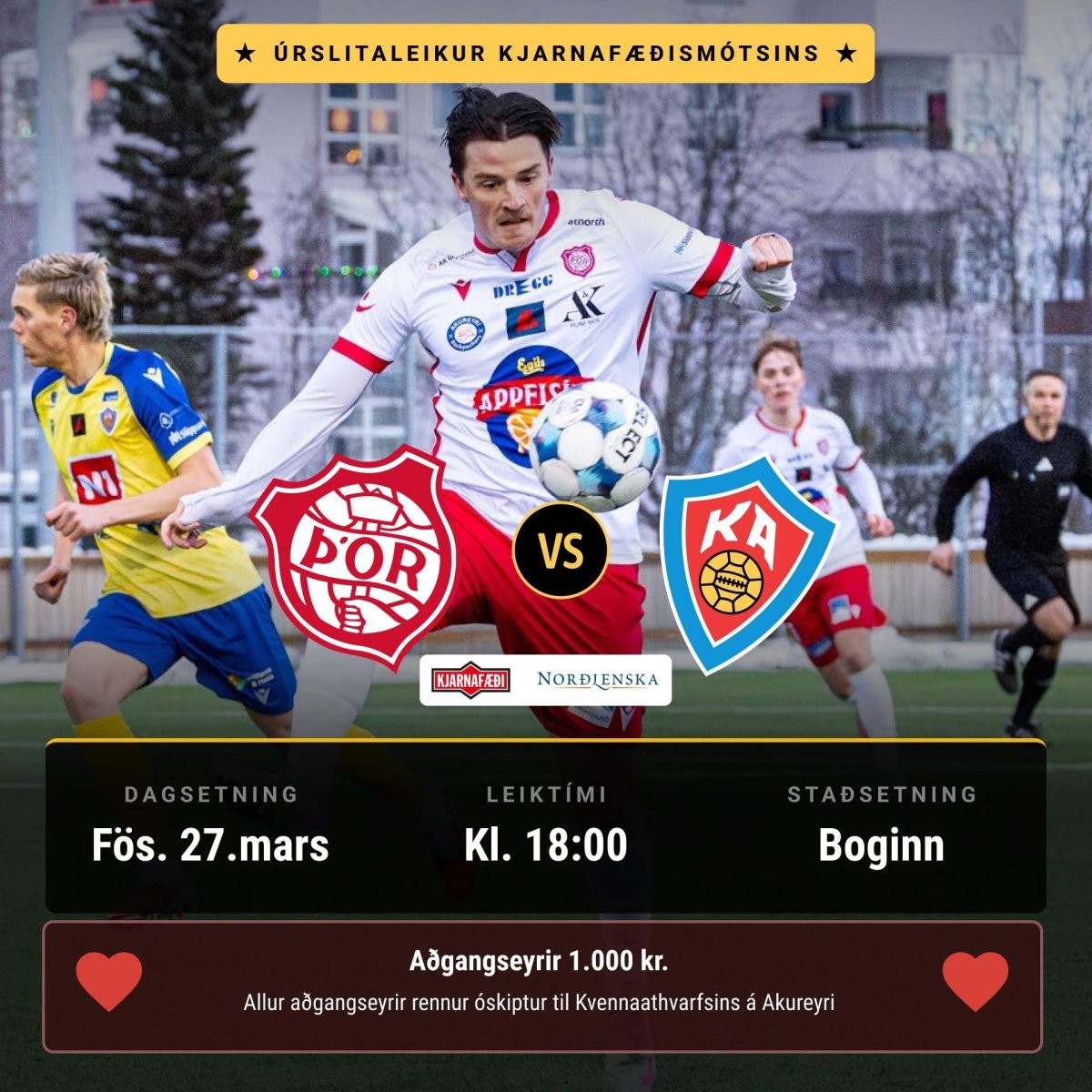 Knattspyrnudómarafélag Norðurlands hefur veg og vanda af mótinu líkt og undanfarin ár og munu selja inn á leikinn en aðgangseyrir er 1000 kr. og rennur allur ágóði til Kvennaathvarfsins á Akureyri.